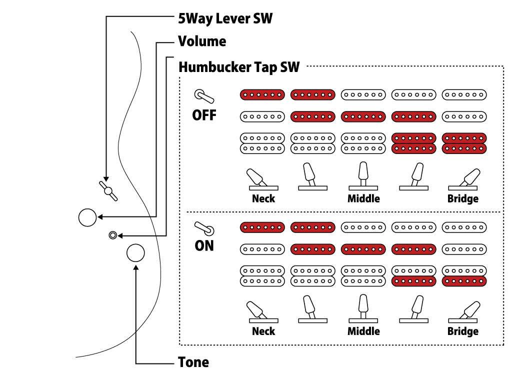 Controls: 1Volume, 1Tone, 5Way Lever SW, Coil Tap Mini SW