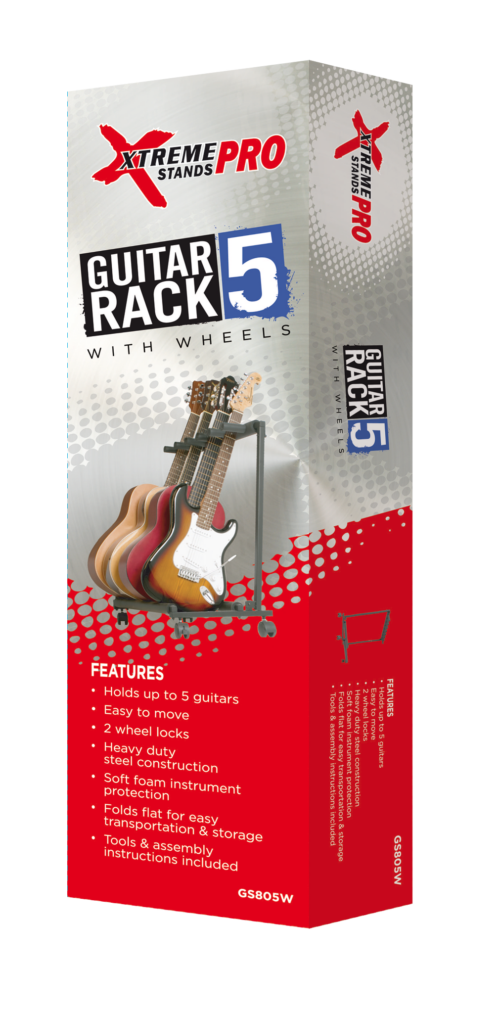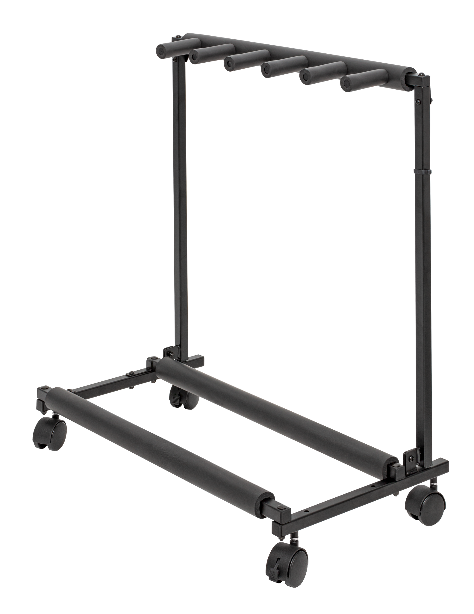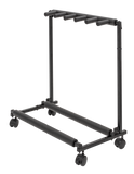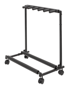 Multi guitar stand with wheels. Heavy duty square section tubular steel frame. Folds up for easy transportation and storage. Extra thick EVA foam rubber protection for neck and body. Holds 5 guitars (mixed acoustic and electric). Supplied unassembled with instructions and tools.