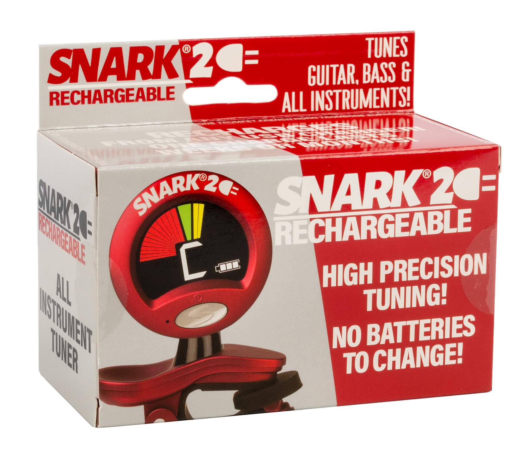 Rechargeable clip-on all instrument chromatic tuner. High resolution, superbright full colour LCD needle display screen with battery charge meter. Pitch shift: 415-466 Hz. High sensitivity vibration sensor. No batteries to change. Power save and auto off feature. Includes USB recharging cable, protective case and soft screen cleaning cloth. Super strong ball joints and clamp. Red.